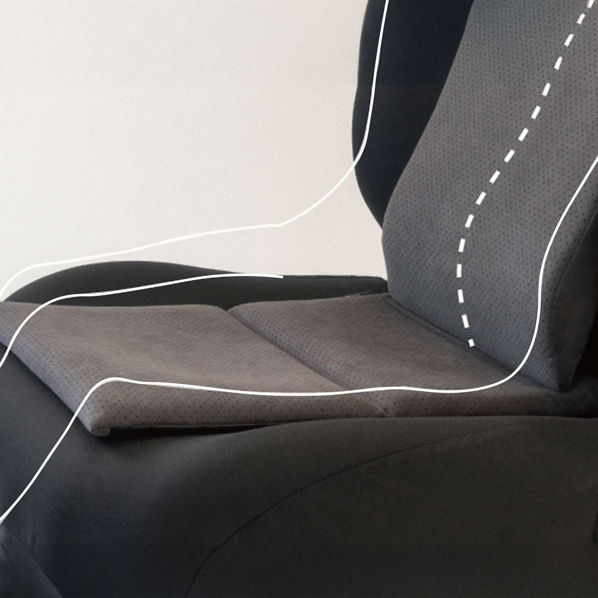 運転時にかかる腰やお尻への衝撃や振動をエクスジェルの体圧流動分散によって緩和。骨盤・腰椎・仙骨をやわらかくサポートしてからだへのストレスを軽減し続けます。