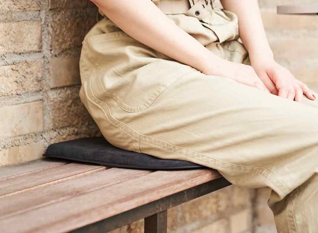 新幹線や飛行機のシートにぴったりのサイズです。長時間の移動で痛くなりやすい尾骨部分にスリットを設け、圧力を軽減します。