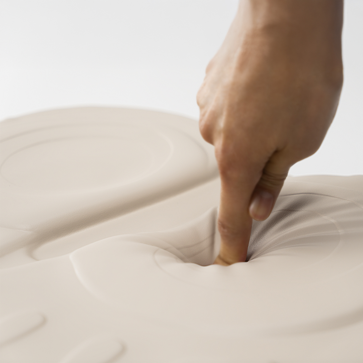 人は座っていても前後左右へ無意識に姿勢を変えます。エクスジェルはその動きに寄り添い、縦方向の圧力だけでなく横方向のズレの力も流動的に分散。ジェルの自在な動きが体の負担を軽減します。